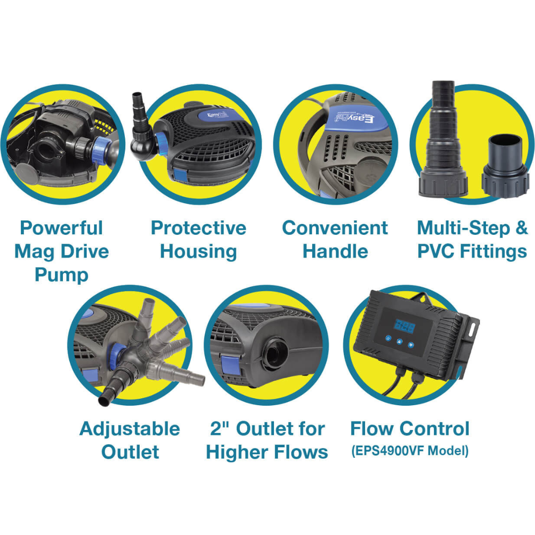 The new Eco-Clear™ submersible pond pumps offer maximum power and energy efficiency. The powerful, asynchronous mag drive pump are inside a durable housing that protects it from debris. There are five Eco-Clear™ pump models to choose from with a range of flows from 1400 to 4850 gallons per hour. These pumps are perfect for pond and waterfall applications.
